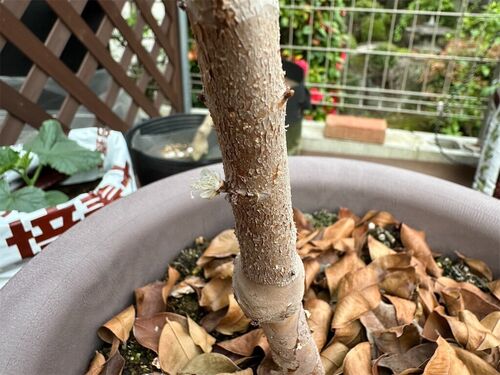 ジャボチカバの木を育てています。冬はずっと室内で、4月から外に出していますが、冬の間は光があまり当たらず、また水もあまりあげていなかったので葉っぱほとんど落ちてしまって大丈夫かな…と思いながら外に出しました。 案の定残りの葉っぱも落ちていった…